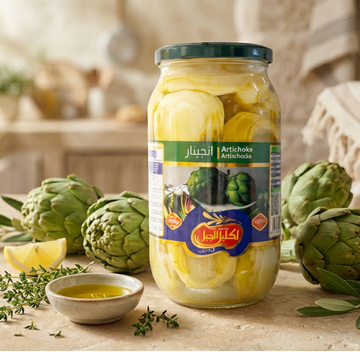 Prezentace produktu: Konzervovaný artyčok ve sklenici a olivy a léčivé rostliny po boku vyjadřují důraz značky na výživnou a středomořskou stravu.